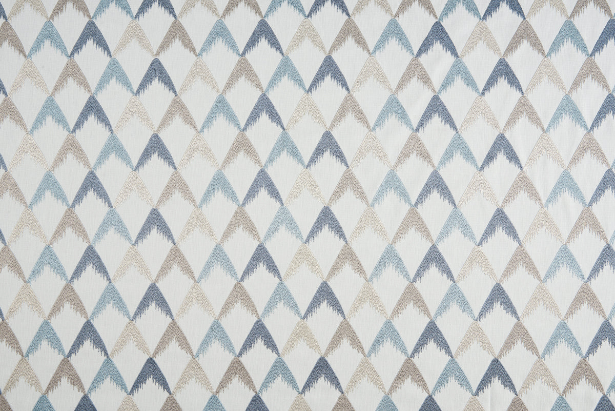 Bill Beaumont Textiles Hideaway Sanctuary fabric in Ocean Mist colourway. Nestle is an embroidered fabric with a geometric design.
