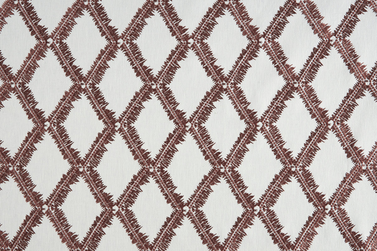 Bill Beaumont Textiles Hideaway Shelter fabric in Maroon Blush colourway. Shelter is an embroidered fabric with a stunning geometric design.