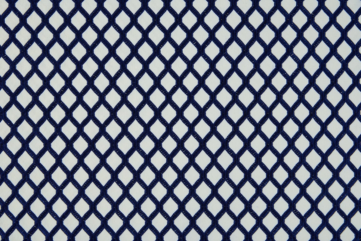 Bill Beaumont Textiles Marrakech Mosaic fabric in Midnight colourway. Mosaic is an embroidered fabric with a simple small geometric trellis design.. is a semi plain fabric with a ripple effect design. Marrakech is a Moroccan-inspired collection of both bold and subdued, exotic embroideries. This artistic combination of colours and designs take varying influences from the decorative tiling, beautifully hand-woven rugs and enticing plantation native to Morocco. With an eclectic array of subtle or striking combinations, it has never been easier to bring a hint of North Africa into your home.