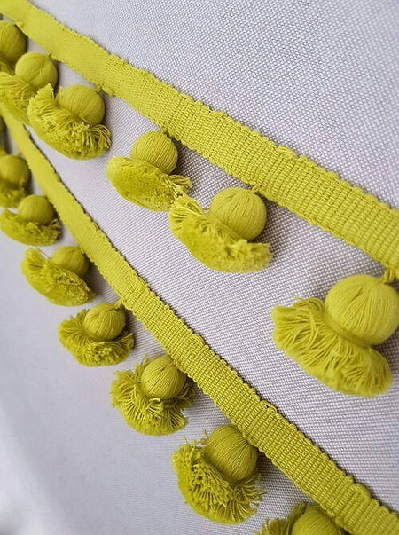 Copper Fox Carnival Big Top Tassel Trimming Lemonade. For Copper Fox the word carnival conjures up memories of crazy, colourful and fun times which are far from dull. It is that very same mix of qualities which they wanted to embody when designing this range. This show stopper, chunky fringe is a nod to the traditional onion fringe and an ideal finishing touch to so many home furnishings.