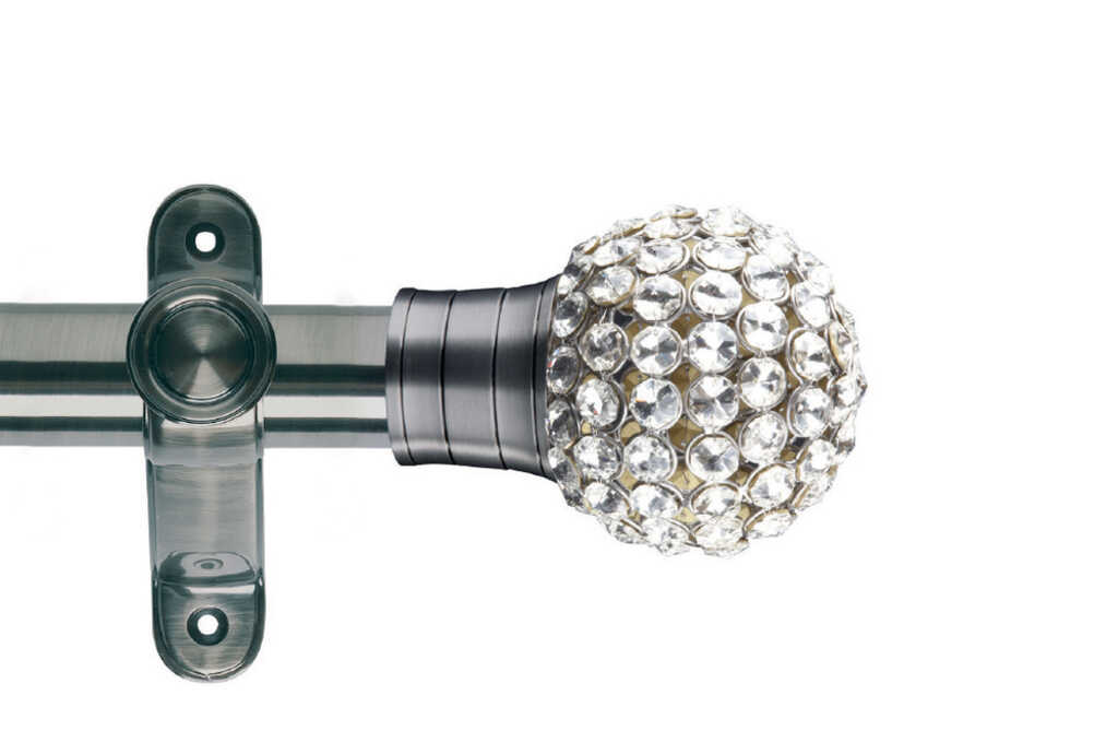 Galleria 50mm Metal Eyelet Curtain Pole in Brushed Silver with Clear Jewelled Cage finials.