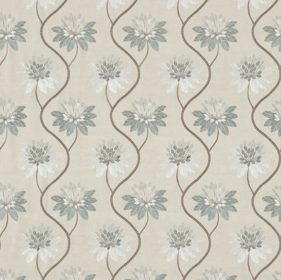 Harlequin Purity Edit Elouise Willow Fabric. Elouise is embroidered on a linen blend ground using various stitching techniques, it is a pretty trailing floral interwoven with metallic threads for gentle highlight detail.