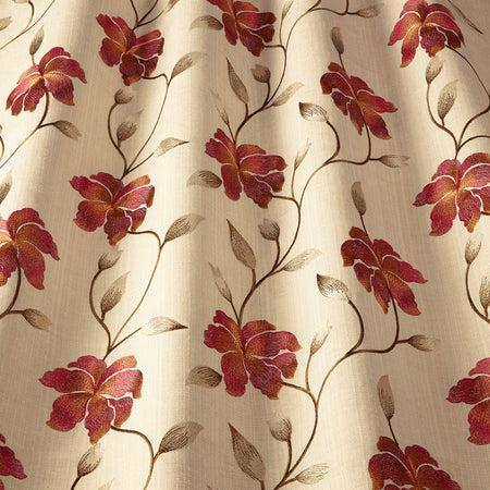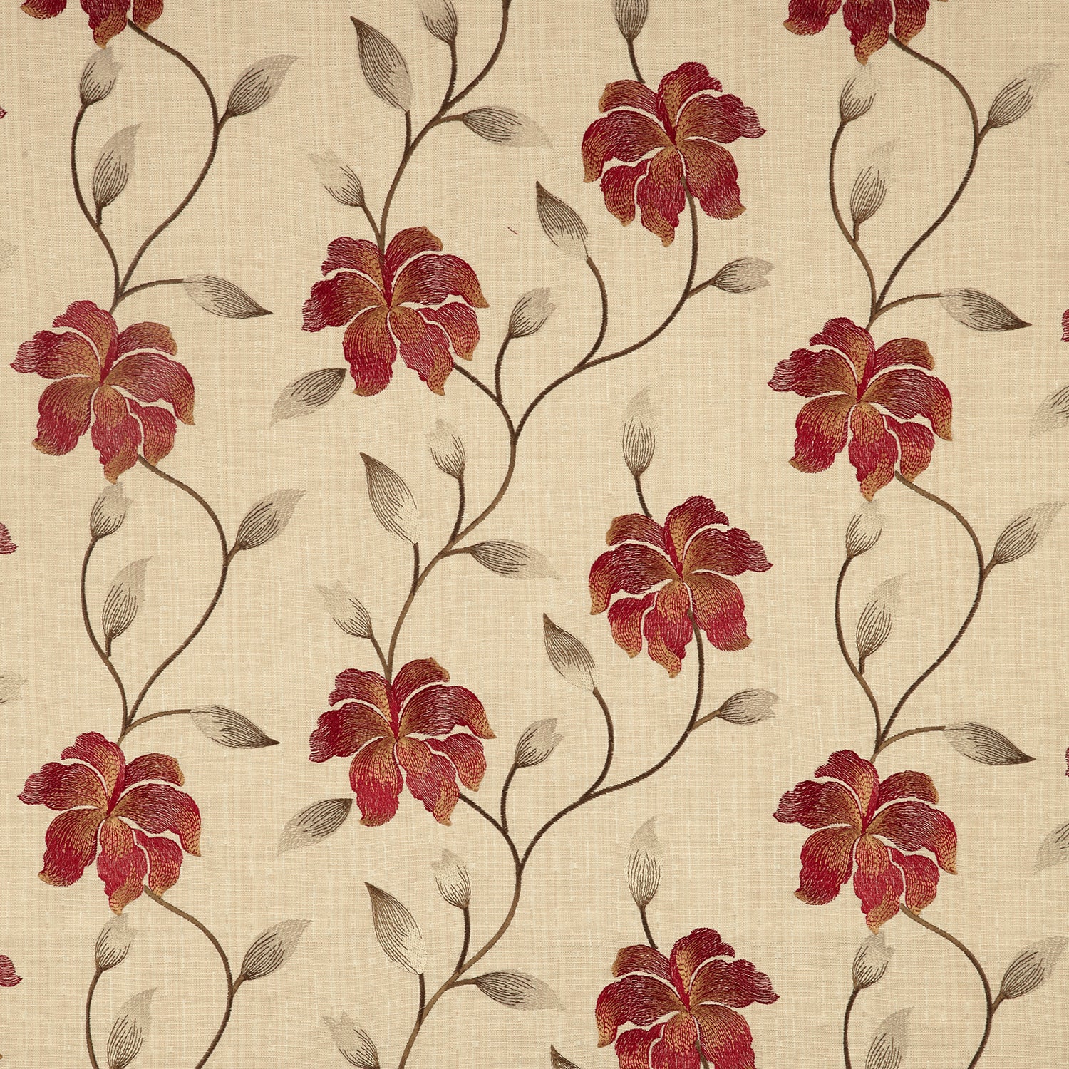 Iliv Art Deco Everglade Fabric in Cherry Colourway. Everglade is an embroidered fabric with a floral trail design.