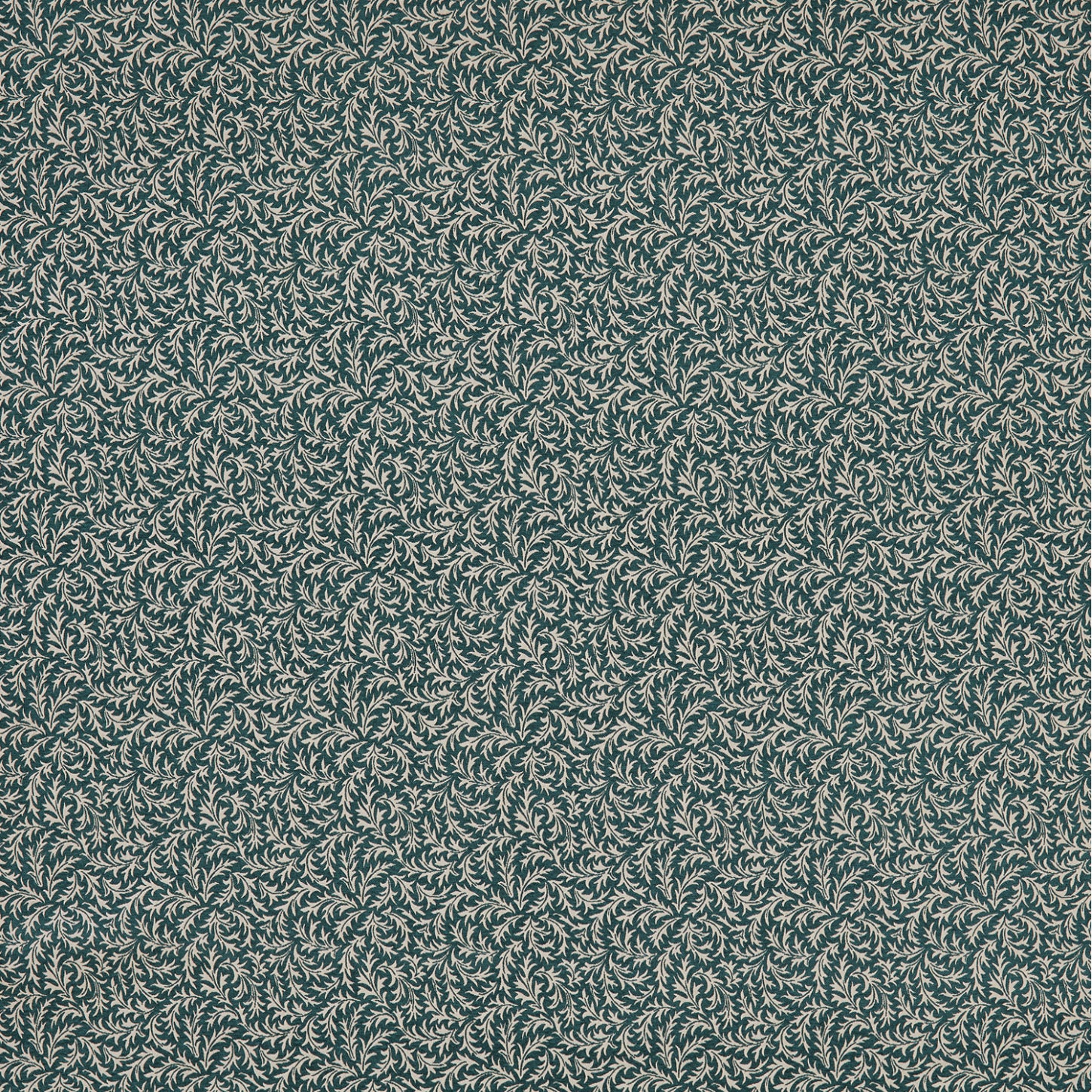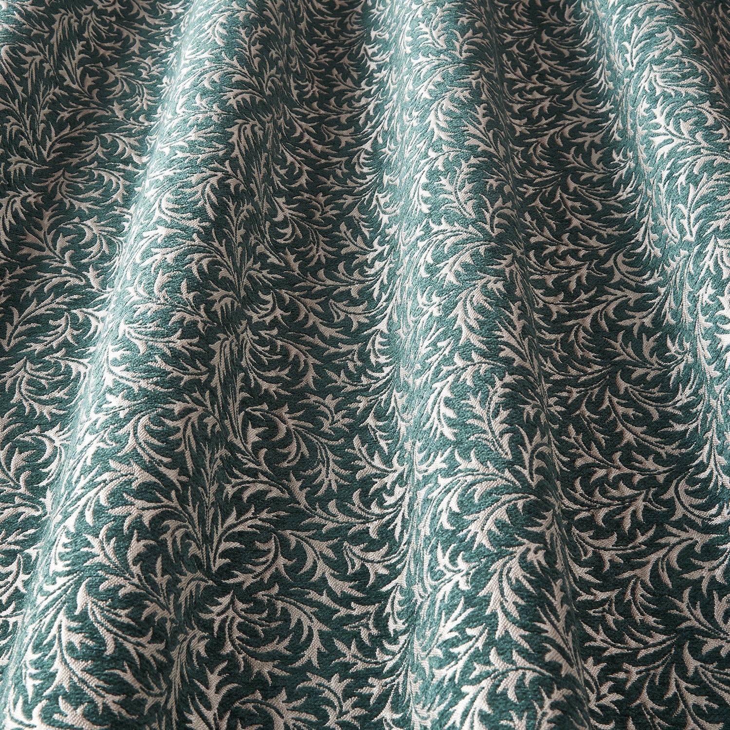 Iliv Interior Textiles Botanist, Aster Fabric in Teal Colourway. Aster is a Chenille fabric with a small leaf design. The Botanist collection offers a combination of stylised florals & butterfly prints, all originated from hand painted artworks, teamed with detailed wool checks and delicate embroideries.