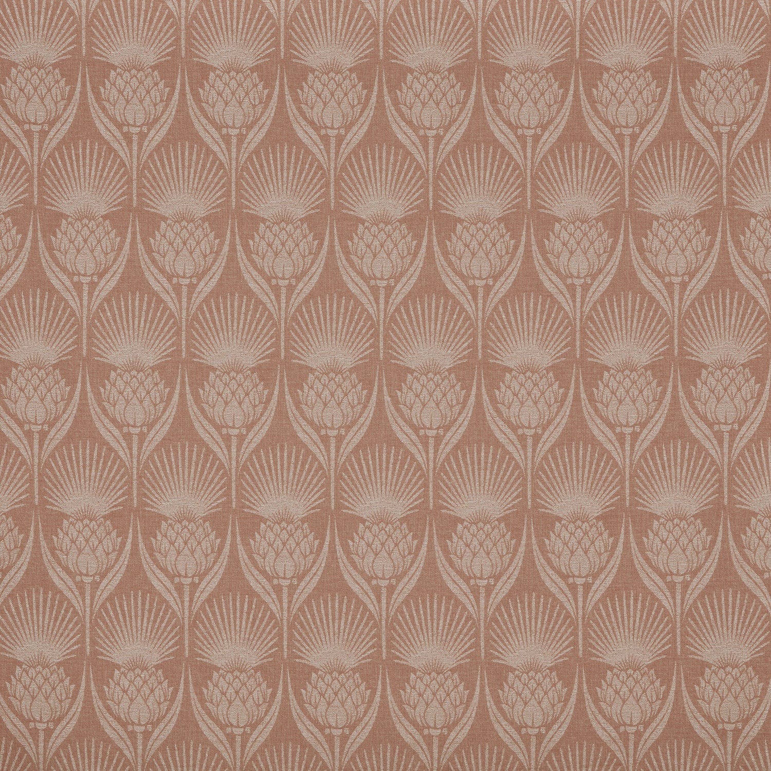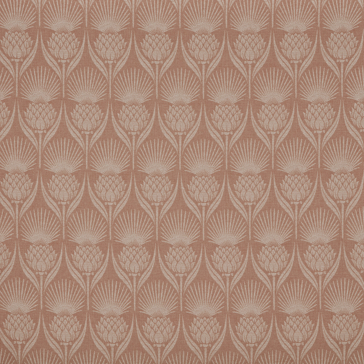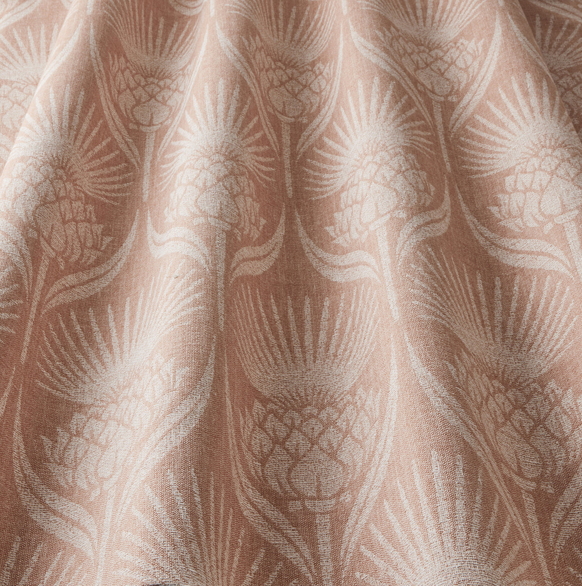 Iliv Interior Textiles Botanist, Eskdale Fabric in Coral Colourway. Eskdale is a woven fabric with a thistle design. The Botanist collection offers a combination of stylised florals & butterfly prints, all originated from hand painted artworks, teamed with detailed wool checks and delicate embroideries.
