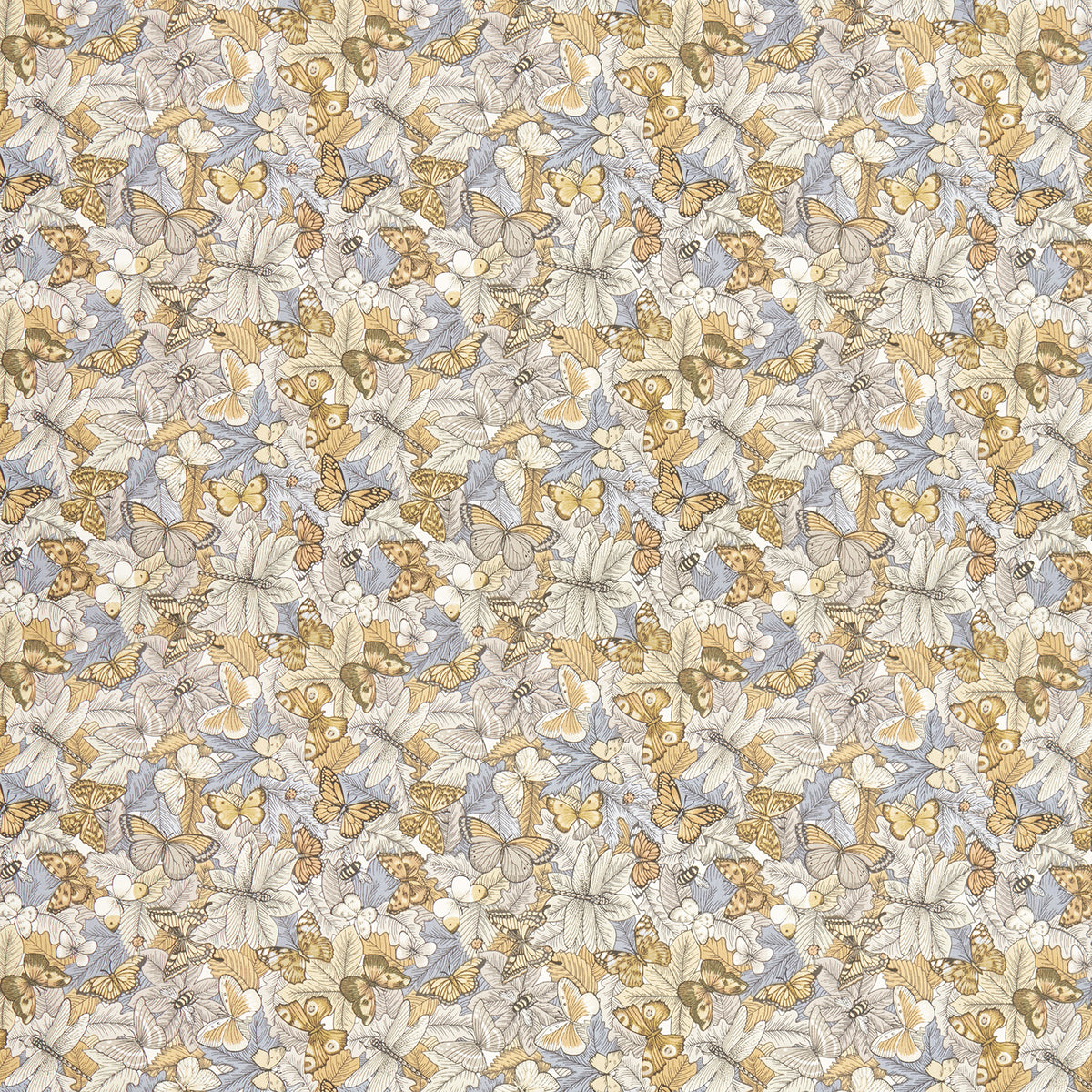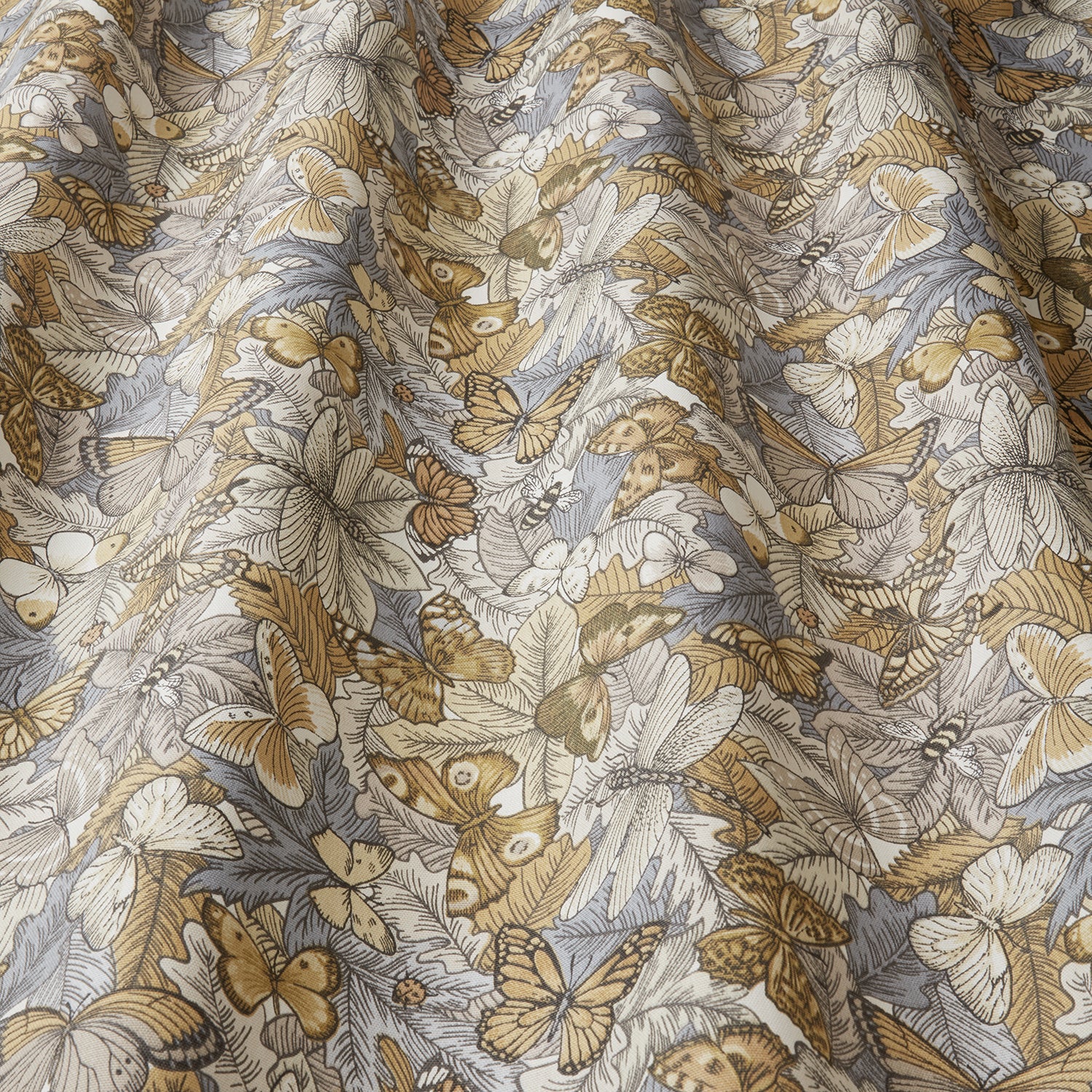Iliv Interior Textiles Botanist, Botanist Fabric in Ochre Colourway. Botanist is a printed cotton fabric with a butterfly design. The Botanist collection offers a combination of stylised florals & butterfly prints, all originated from hand painted artworks, teamed with detailed wool checks and delicate embroideries.