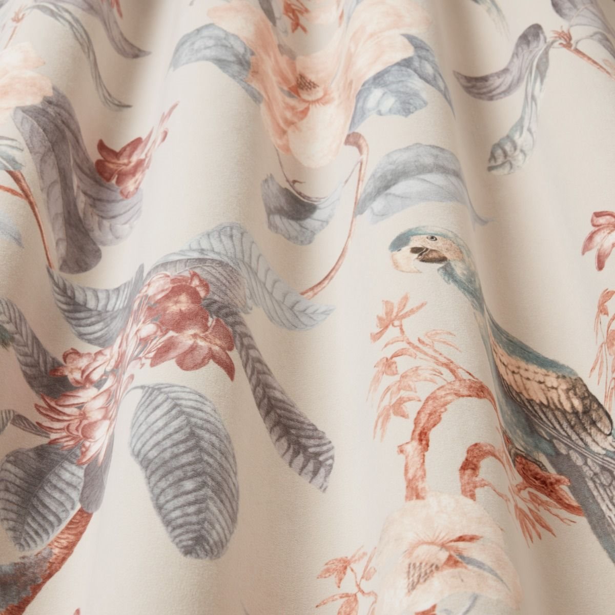 Iliv Enchanted Garden Parchment Fabric. Enchanted Garden is a velvet fabric with a floral and bird design.