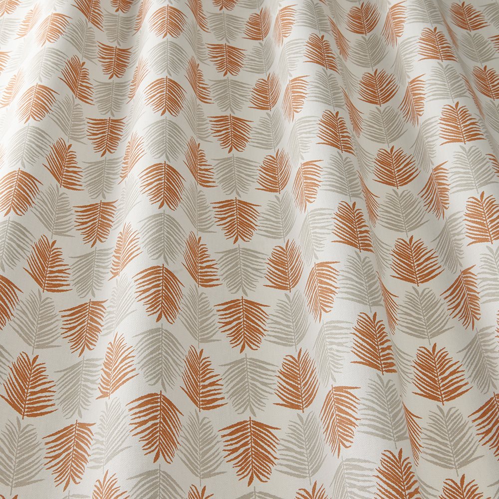 ILIV Maldives, Alfresco Fabric in Mandarin Colourway. Alfresco is a printed cotton fabric with a small leaf design. Vibrant prints are teamed with contemporary leaf designs. Detailed embroideries and textural velvets are also available in this collection.