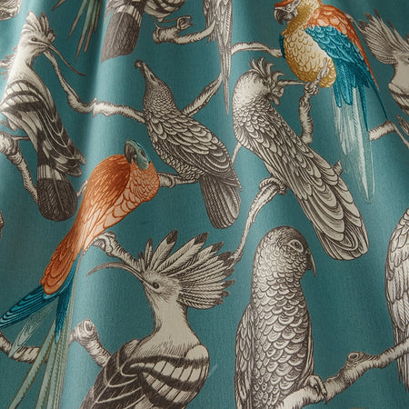 ILIV Maldives, Aviary Fabric in Lagoon Colourway. Aviary is a printed cotton fabric with a bird design. Vibrant prints are teamed with contemporary leaf designs. Detailed embroideries and textural velvets are also available in this collection.