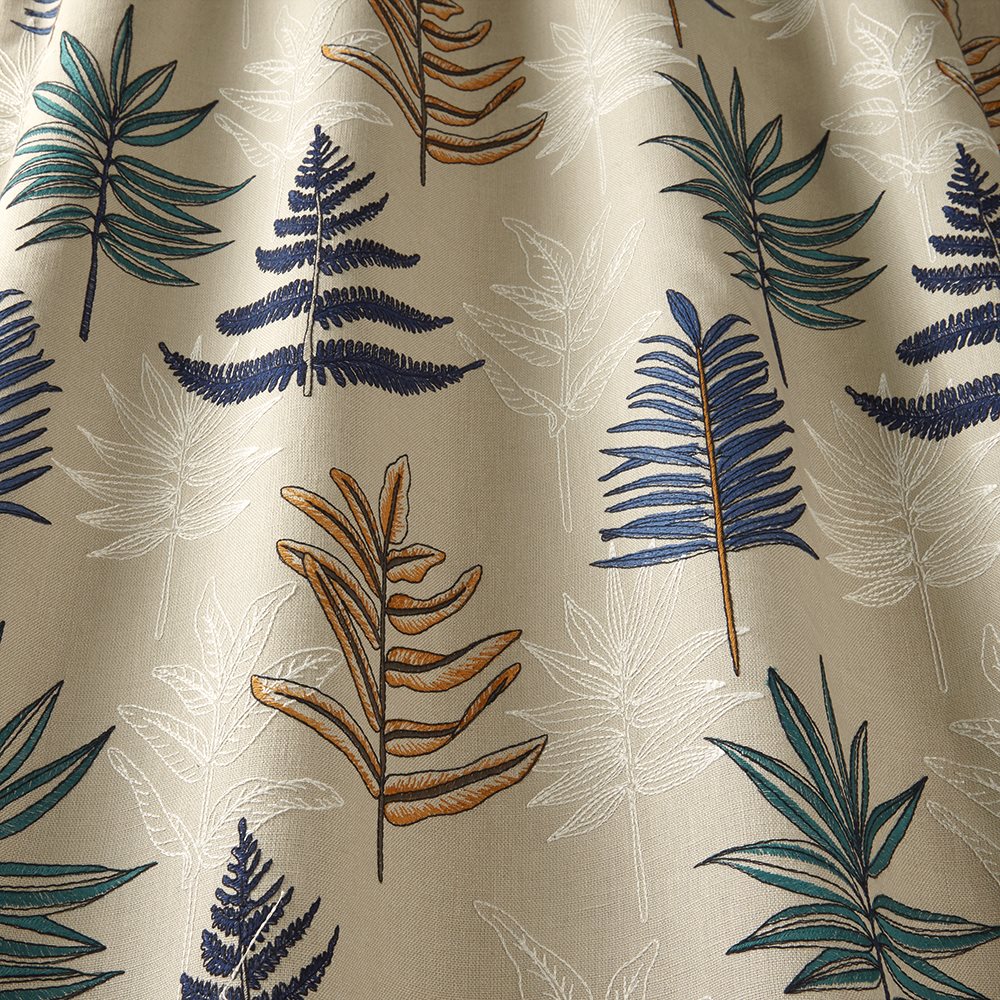 ILIV Maldives, Seychelles Fabric in Marine Colourway. Seychelles is an embroidered fabric with a leaf design. Vibrant prints are teamed with contemporary leaf designs. Detailed embroideries and textural velvets are also available in this collection.