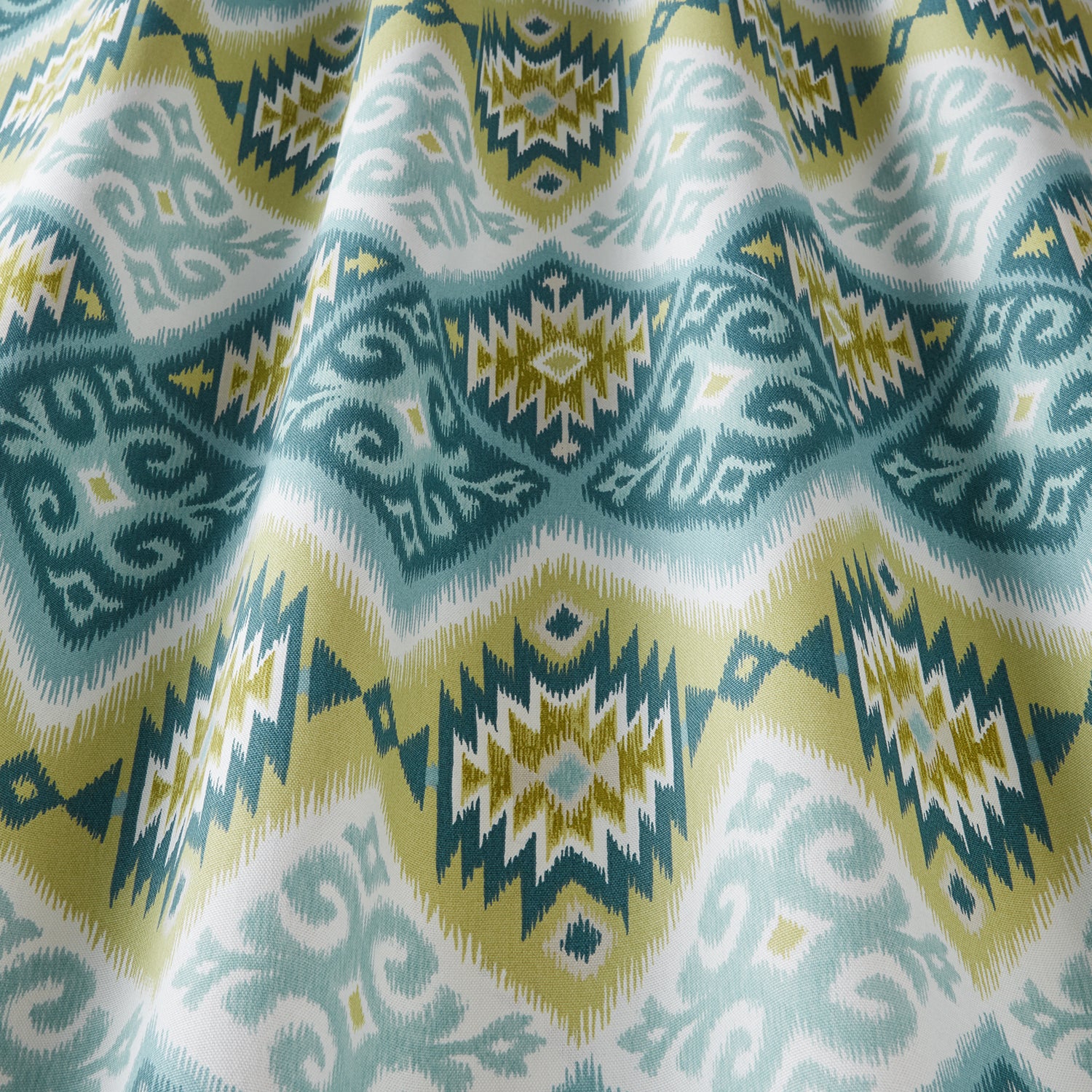 Iliv Interior Textiles Navajo, Navajo Fabric in Dusk Colourway. Navajo is a printed cotton fabric with an Aztec design. Navajo collection takes inspiration from Indigenous and tribal roots. Available in six colour themes which embrace and capture bright and bold colour which are associated with the native Americans, the collection brings character and personality to any interior.