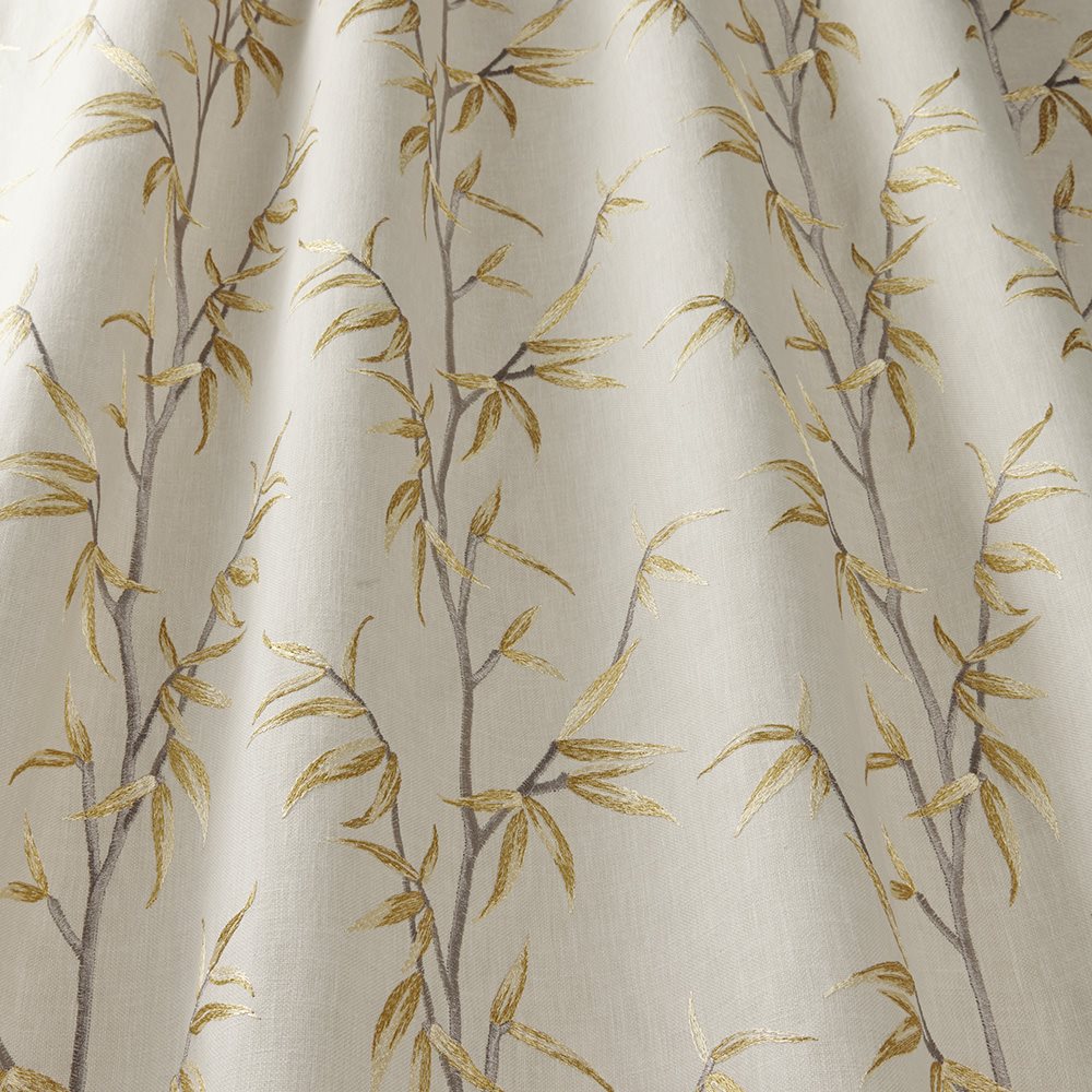 Iliv Interior Textiles Orientalis, Sumi Fabric in Saffron Colourway. Sumi is a embroidered fabric with a delicate trailing leaf design. Boasting decorative Chinoserie scenes, trailing florals and structured geometric designs.