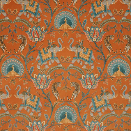 ILIV Orissa Sumatra Velvet Papaya Fabric. Sumatra is a printed velvet fabric with an elephant motif.