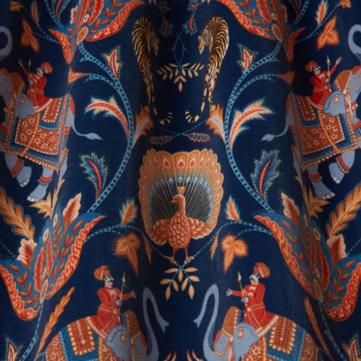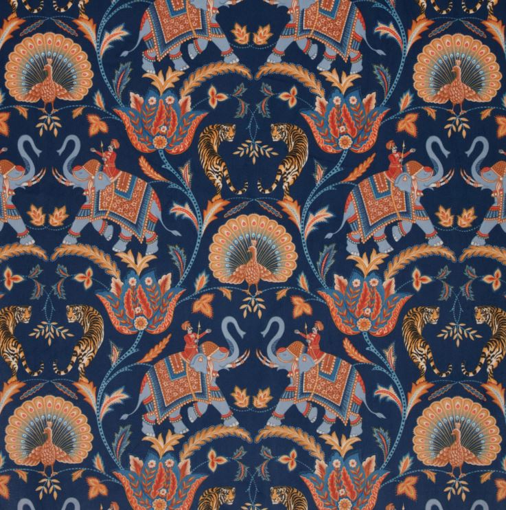 ILIV Orissa Sumatra Velvet Sapphire Fabric. Sumatra is a printed velvet fabric with an elephant motif.
