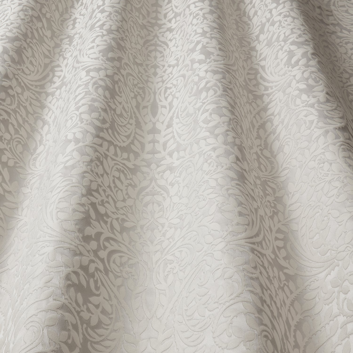 Iliv Interior Textiles Valentina, Alexandria Fabric in Frost Colourway. Alexandria is a woven fabric with a stunning damask design. Teatro collection offers majestic grandeur across classical designs. Sophisticated cut velvets and all-over Jacobean embroideries on lustrious satins are layered with high density woven jacquards which creates exceptional relief to the designs.