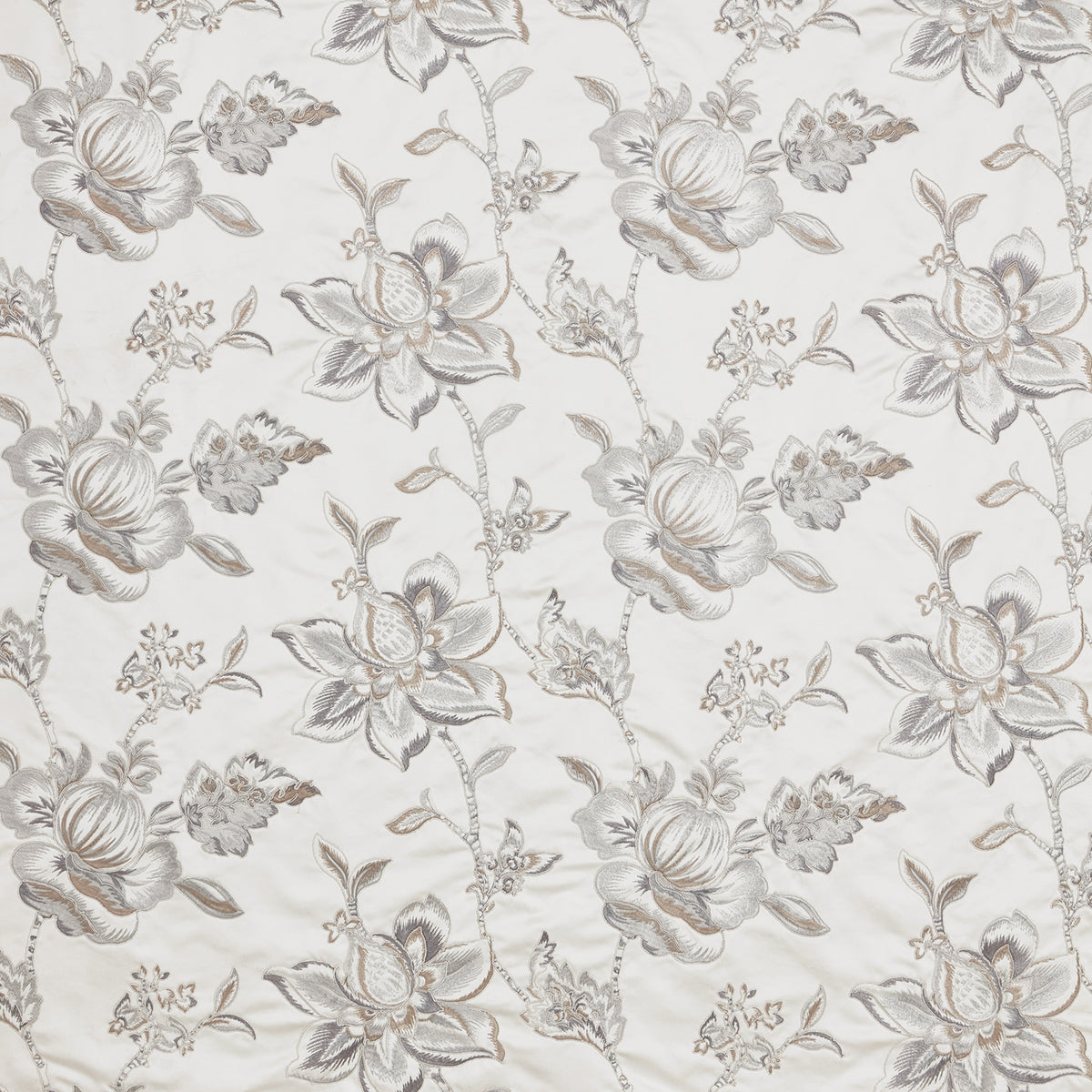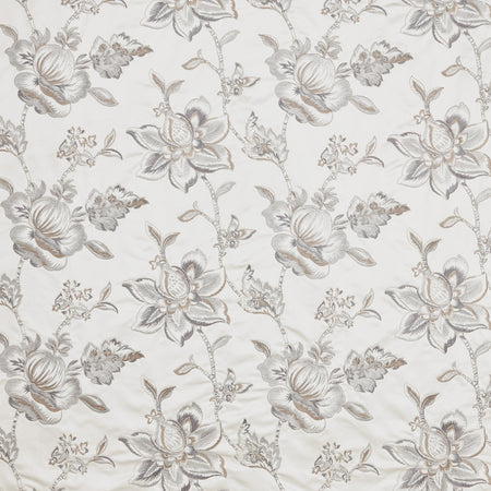 Iliv Interior Textiles Teatro, Florentina Fabric in Frost Colourway. Florentina is an embroidered fabric with a stunning floral design. Teatro collection offers majestic grandeur across classical designs. Sophisticated cut velvets and all-over Jacobean embroideries on lustrious satins are layered with high density woven jacquards which creates exceptional relief to the designs.