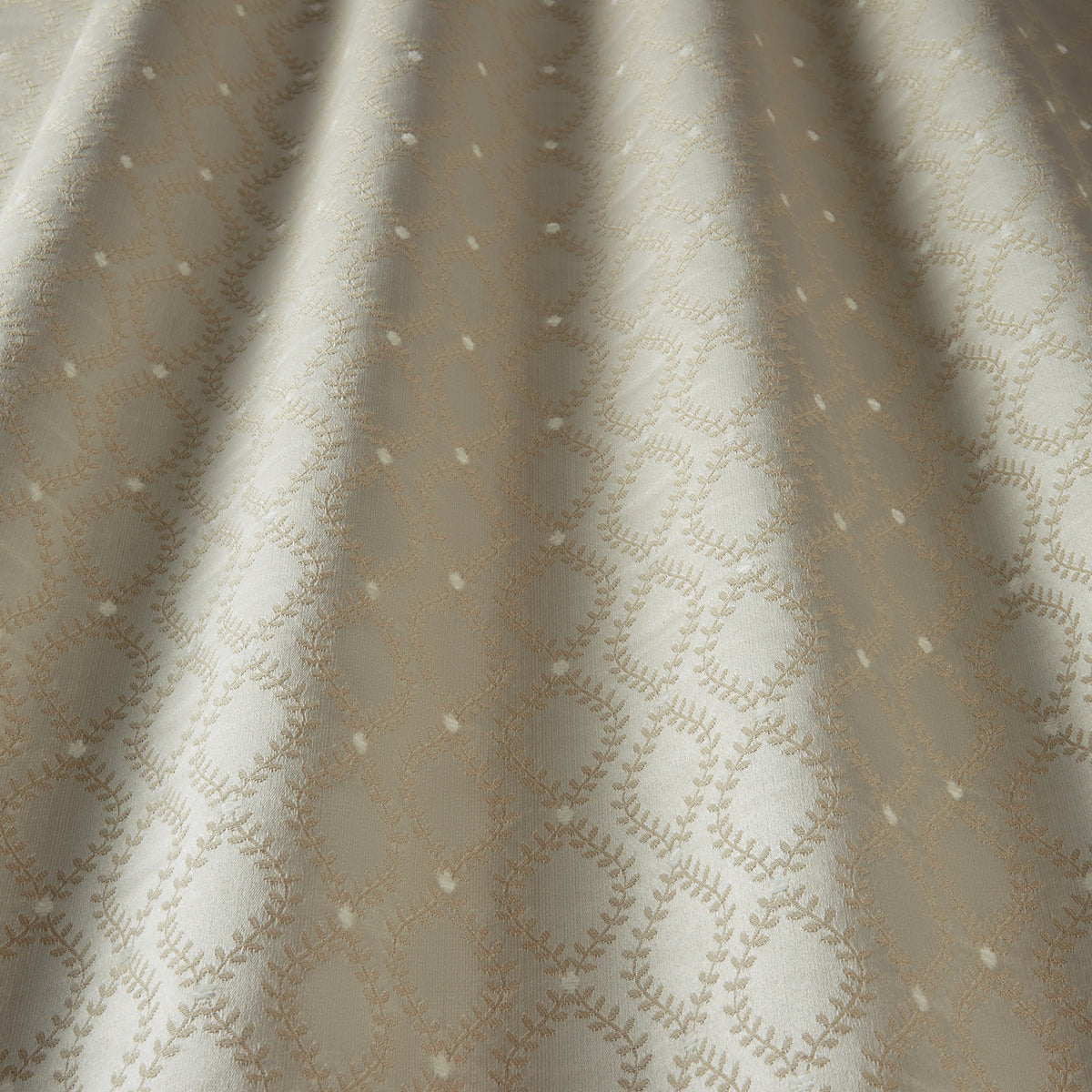 Iliv Interior Textiles Valentina, Tallis Fabric in Caramel Colourway. Tallis is a woven fabric with a geometric trellis design. Teatro collection offers majestic grandeur across classical designs. Sophisticated cut velvets and all-over Jacobean embroideries on lustrious satins are layered with high density woven jacquards which creates exceptional relief to the designs.