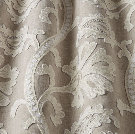 ILIV Verini Seraph Linen Fabric. Seraph is an embroidered fabric with a trailing leaf design.