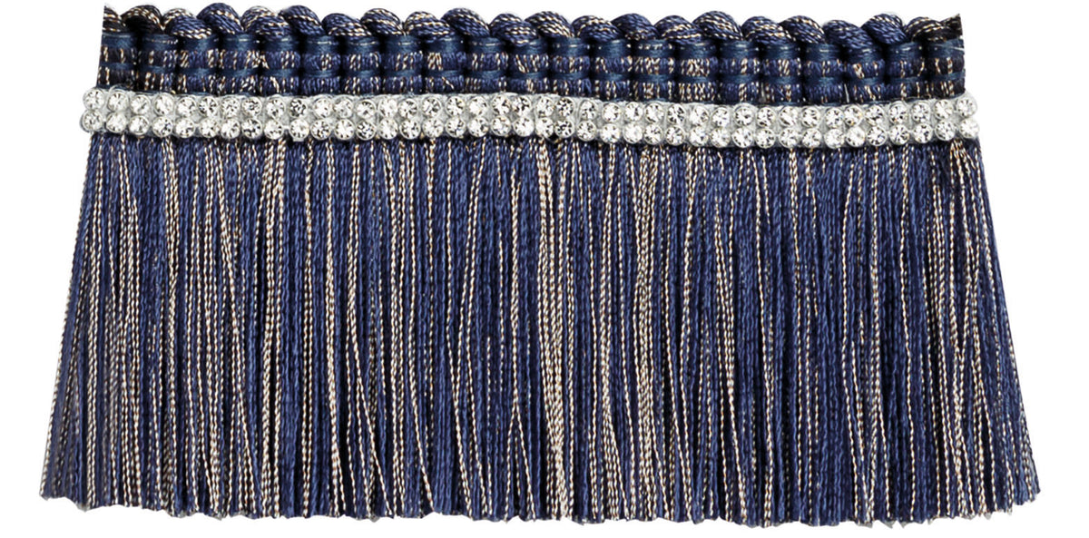 JLS Astral Diamante Ruche in Blue colourway. This stunning collection features a range of co-ordinating trimmings including braid, Tiebacks, and tassel fringe, border trim, ruche trim and beaded fringe.