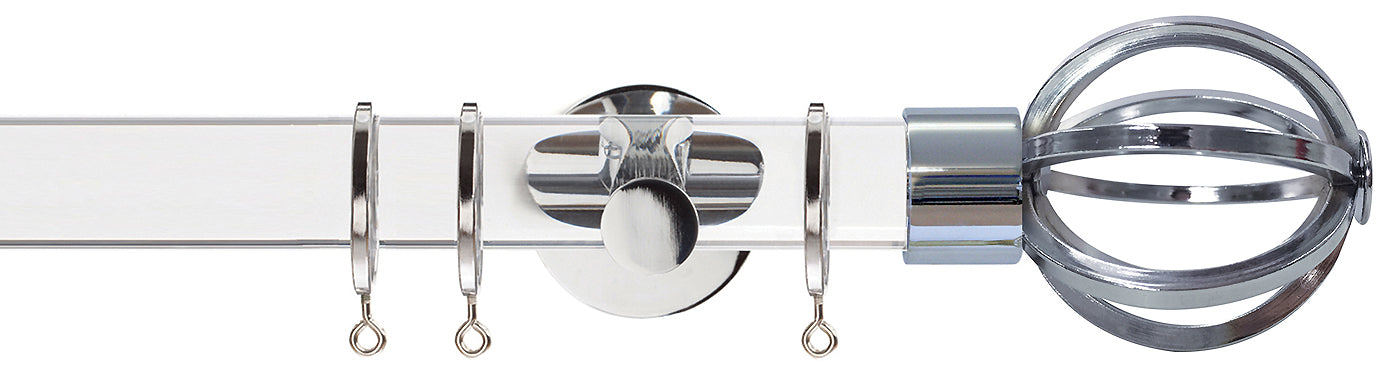 Jones Strand Acrylic 35mm curtain pole with Chrome Cage finials and Matt Nickel brackets and rings. The Strand Acrylic collection is a new and exciting range of clear acrylic curtain poles with metal rings and brackets with a stunning collection of finials to choose from.