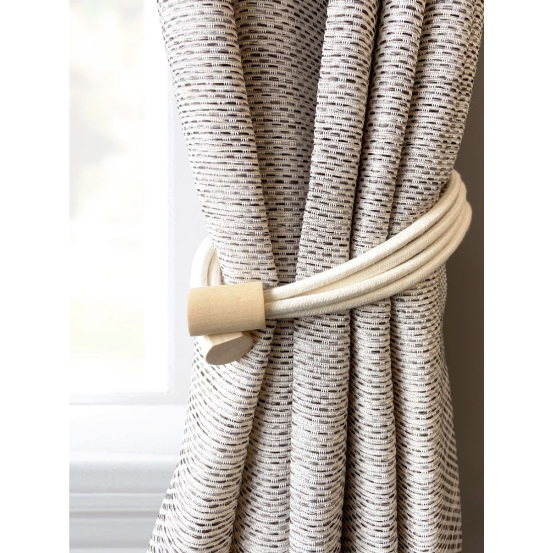 Laura Ashley Adelie Magnetic Natural Tieback. These no-fix tiebacks are easy to install without the use of tieback hooks, avoiding the need to drill into a wall. The magnetic clasp creates a loop that will embrace your curtains neatly to one side with minimal effort. Adelie is a classic Laura Ashley design that features natural elements of wood and cotton to create a warm and homely feel with a touch of coastal style.