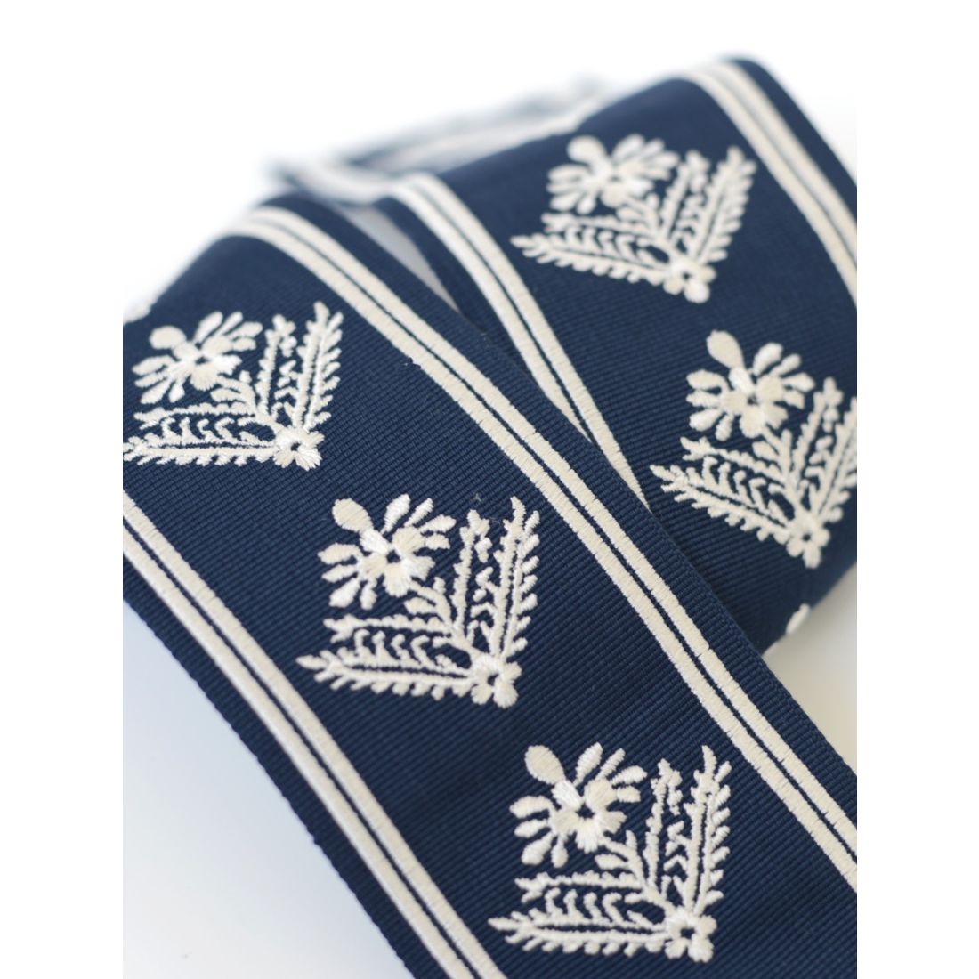 Laura Ashley Borders Lady Fern Midnight Navy Trimming. Lady Fern is a delightful design from the Heritage-inspired collection. It features elegant, filigree-like leaves and delicate flowers. The design is accentuated by a bold double stripe that outlines its edges, creating a strong botanical vibe and evoking a powerful sense of nature.