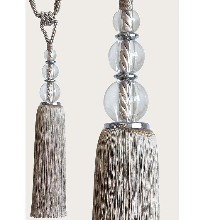 Laura Ashley Selby Curtain Tieback in Truffle. With a clear, hourglass body and polished chrome inserts the Laura Ashley Selby Tassel Tieback will create enduring elegance in any home.
