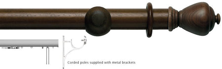 Rolls Modern Country Corded 45mm and 55mm wood curtain pole set in Dark Oak with Sugar Pot finials and metal brackets. The Rolls Modern Country 45mm and 55mm wood curtain pole collection is lovingly hand-crafted in the UK. Modern Country is a superb collection of hand-painted and stained wood curtain poles with timeless finial designs. Washed and Waxed finished for that modern country look that works well in both town and country homes.