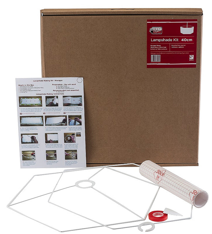 Needcraft 40cm Hexagonal Lampshade Kit from Hallis Hudson. The kits include components needed to create a professional lampshade, all you need to do is add your own fabric. The kit include 2 x Lampshade Rings, 1 x Self-Adhesive Lampshade Panel, 1 x Roll of Self-Adhesive Panel, 1 x Roll of Self-Adhesive Tape, 1 x Rolled Edge Tool & Instructions.