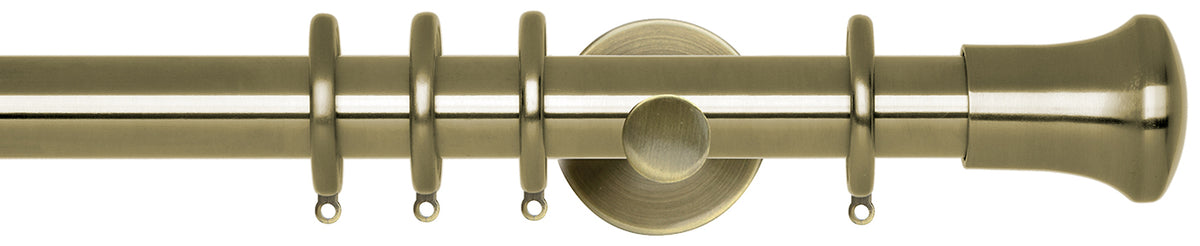 Rolls Neo 28mm by Hallis Hudson Metal Curtain Pole in a Spun Brass effect finish with Trumpet finials and contemporary cylinder style brackets. A stunning, modern metal curtain pole with a stylish minimalistic look supplied complete with nylon lined curtain rings to ensure a quiet, smooth travel along the pole.