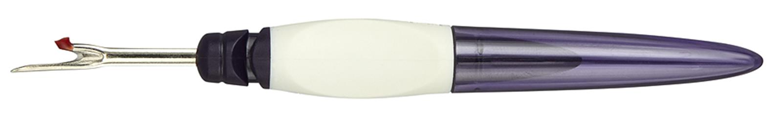 Prym Stitch Ripper. Ergonomic design stitch ripper with a blade and ball point. Designed to increase comfort in use and reduce fatigue, the stitch ripper has an anti-slip soft surface on the ergonomically formed handle recess. The stitch ripper comes with a protective cap which can be slipped on to the handle for a practical extension - as shown in the picture.