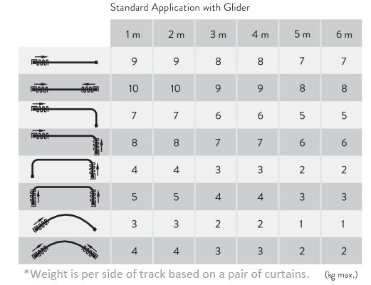 * Suitable for heavy weight curtains. Please see weight reference diagram above (weight is per side of the pole and based on a pair of curtains).
