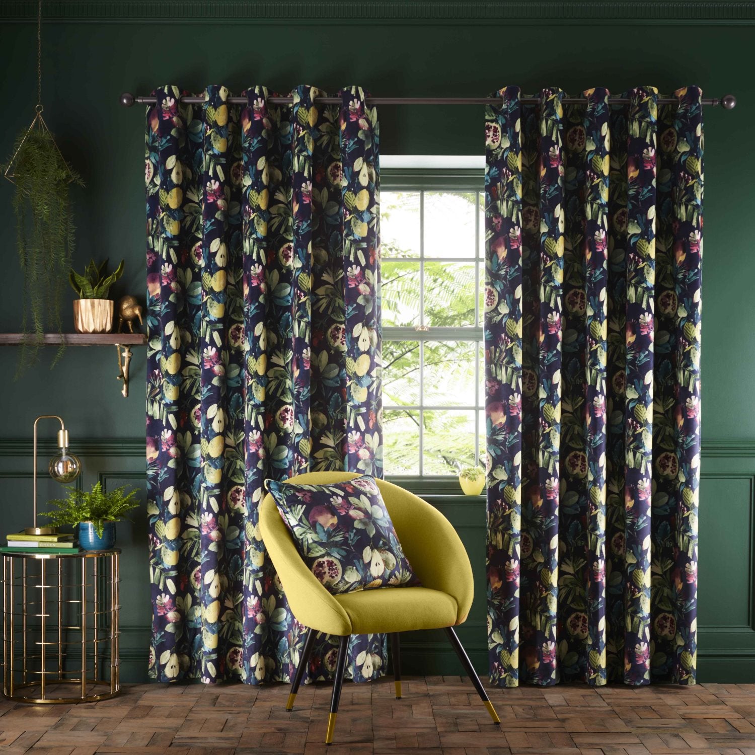Studio G Copenhagen Eyelet Curtains Midnight. Copenhagen is a contemporary design of colourful summer fruits printed on a soft velvet. It has cream polycotton lining and eyelet heading.