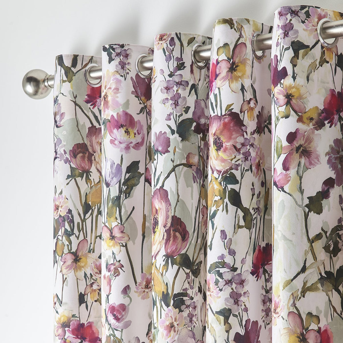 Studio G Meadow Eyelet Curtains Antique. Meadow highlights an expressive interpretation of meadow flowers, including wild peonies, poppies, daisies and chrysanthemums, contrasting beautifully against a background to create a fresh, springtime look. This new print for the Studio G collection takes a slightly daintier but no less impactful approach to meadow florals. Painterly blooms in dusty rose and soft magenta tones spring forth from the Antique ground, a creamy neutral, softened further with strokes of watercolour sage green for a truly beautiful, serene meadow print.