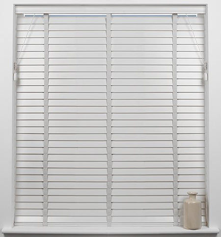 Universal Hardwood 50mm Slat Venetian Blind in a White finish. These stunning wood venetian blinds are made using natural hardwood slats and will add a modern, luxurious feel to any room. Mounted on to a durable metal head rail and offering a positive cord lock and modern wand tilt mechanism. The blind can be easily trimmed to size up to 75mm each side.