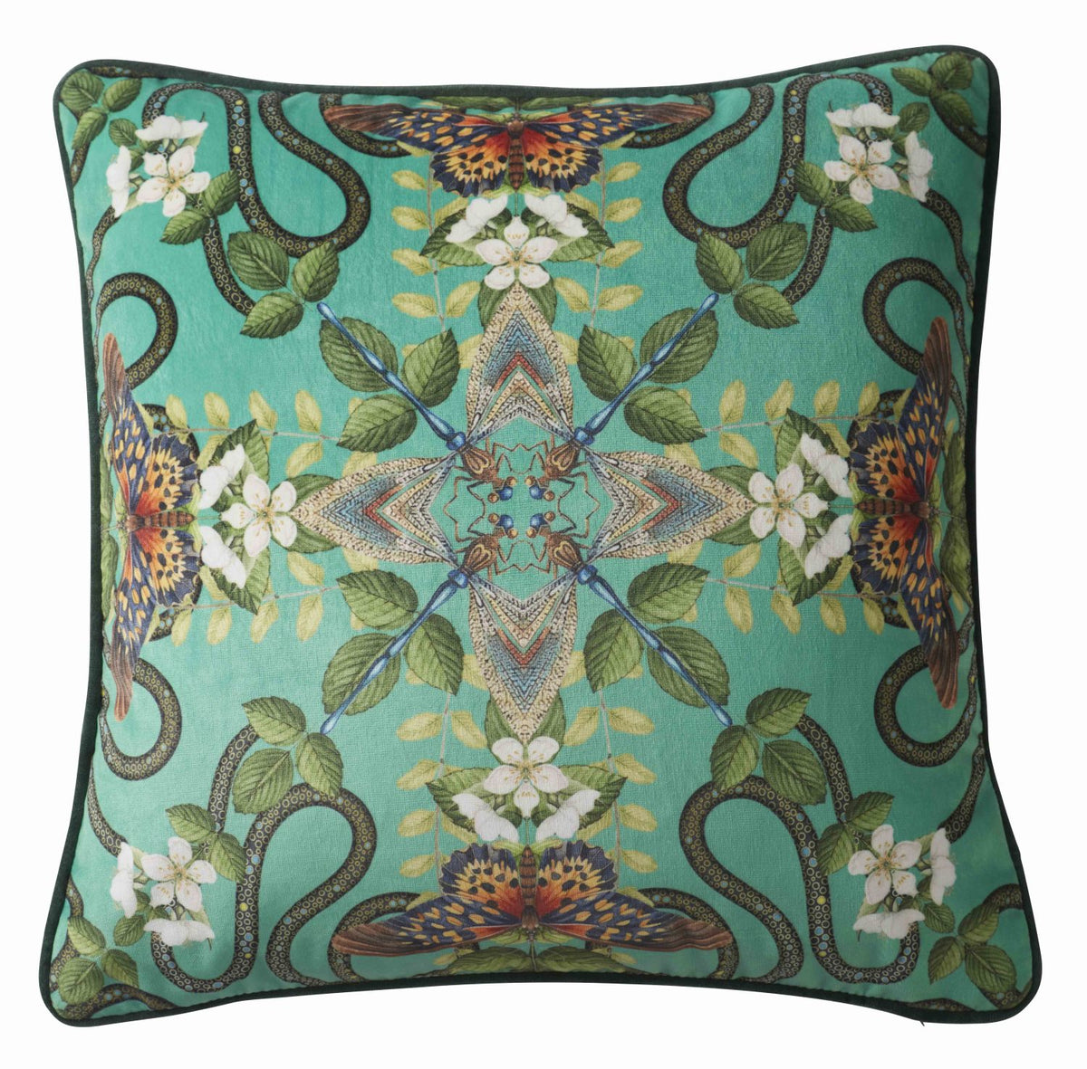 Wedgwood by Clarke & Clarke Emerald Forest Cushion Emerald. Emerald Forest lets you lose yourself amongst the plush foliage of this design. It is adorned with English flora and fauna, it is a square velvet cushion is feather filled and finished with a contrasting piping. Now you can be the master of your own green and pleasant land.