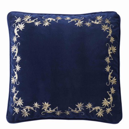 Wedgwood by Clarke & Clarke Sapphire Garden Cushion Midnight. Sapphire Garden is inspired by the Grand Tour, this velvet cushion is influenced by Wedgwood's archival designs, with temple-dwelling monkeys and Indian decorative designs beautifully embroidered in metallic gold thread.