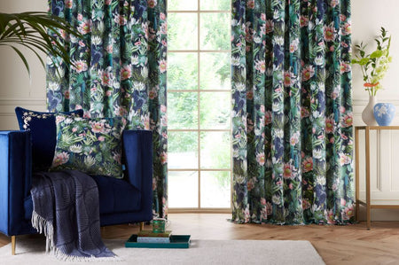 Wedgwood by Clarke & Clarke Waterlily Pencil Pleat Curtains Midnight. Printed with giant waterlilies, these beautiful velvet curtains will finish off any room.