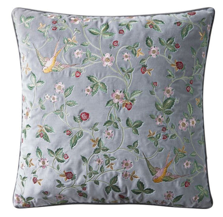 Wedgwood by Clarke & Clarke Wild Strawberry Cushion Smoke. Feast your eyes on this delicious Wedgwood design from 1964 inspired by fresh, wild strawberries. Recreating the feelings of a lazy English summer, finely embroidered leaves and flowers transport you to a country garden where the smell of cut grass floats in the air. This cushion also has a piped edge.